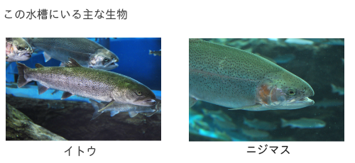 水族館中央に位置する大きなドーナツ型の「二重回遊水槽」では、希少魚の「イトウ」や大型の「ニジマス」など約3千匹の魚達が泳いでいます。小さな魚が大きな魚に食べられてしまわないの?という心配の声をいただきますが、実は、この水槽は内外で二重に仕切られています。一緒に泳いでいるように見える魚たちですが、大きな魚は外側、小さな魚は内側を泳いでいるのです。透明度の高い富士山の湧水を使用しているからこそ、このようなおもしろい演出が可能になるのです。